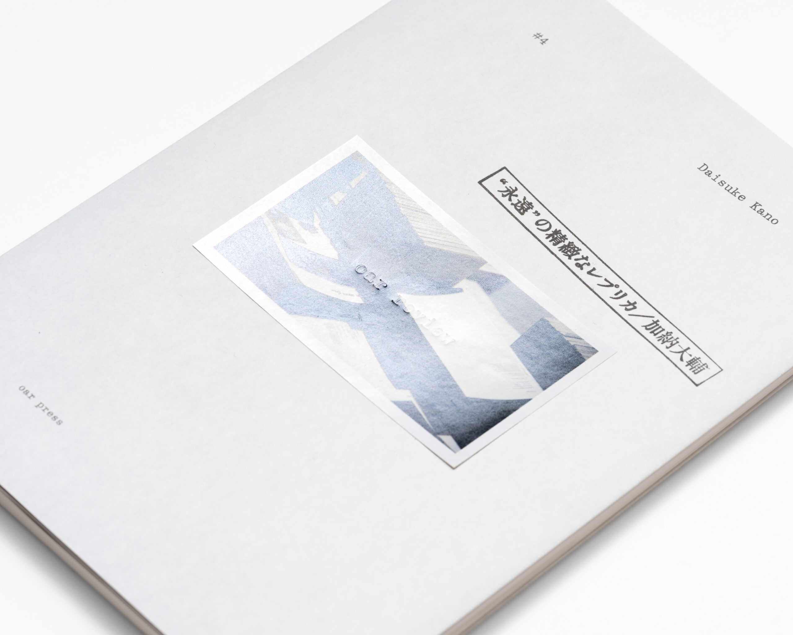 This fourth volume features Daisuke Kano’s “Our Exquisite Replica Of ‘Eternity'”, originally published between September 2022 and July 2023. As a graphic designer working with printed matter, Kano traces the words and events that circulate around media, offering a critical reflection on the role of reproduction, publishing, and print in the contemporary moment. A place called the book—endless, reflecting light that continues to shimmer from a distant past—where our voices do not cease.